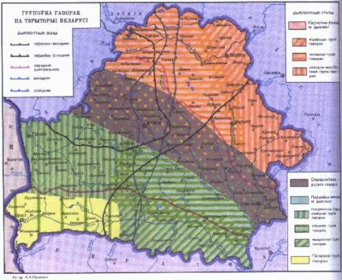 Северо-Восточный диалект [Northeast Belorussian] Примерная граница между северо-восточным и юго-западным диалектами идёт по линии Вильнюс — Минск — Рогачёв — Гомель. Принципом деления служит характер аканья и некоторые другие фонетические особенности. Северо-восточное наречие характеризуется диссимилятивным аканьем и яканьем, т. е. гласные о и е произносятся в первом предударном слоге как а (‘a), если под ударением находится не гласный а, но как ы или і, если под ударением находится гласный а: нагі, вады, зямлі, но ныга, выда, зімля. Кроме того, здесь сохраняется мягкое р, в 3-м лице единственного числа глагола представлено оконча-ние -ць: ідзець, нясець, бярэць, в функции сказуемого возможны именные прилагательные: ён добр и т. д. Полоцкая группа говоров [Polots] Витебская группа говоров [Viteb] Восточно-Могилёвская группа говоров [Mogilev] Юго-Западный диалект [Southwest Belorussian] Юго-западное наречие характеризуется прежде всего недиссимилятивным аканьем и яканьем, т. е. гласные о, е, а также ‘a в первом предударном слоге произносятся всегда как а (‘a), независимо от характера ударяемого гласного: вада и вады, нага и нагі. Кроме того, в этом наречии произошло отвердение мягкого р; утрачено окончание -ць в 3-м лице единственного числа глаголов первого спряжения: ідзе, нясе, бярэ; ы после губных согласных перешло в у: спутаць вм. спытаць; в функции сказуемого употребляются только местоименные прилагательные: ён добры. Гродненско-Барановичская группа говоров [Grodnen-Baranovich] Слуцкая группа говоров [Slutsk] Мозырьская группа говоров [Mozyr] Среднебеллоруские переходные говоры [Central Belorussian] — Лежат в основе литературного языка. Полесские говоры — Занимают территорию районов Берестейщины и Пинщины, между левым берегом Нарева и Горыни. Близки северному наречию украинского языка