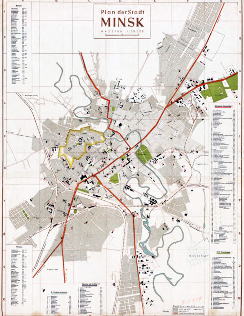 К сожалению, ни даты ни перевода легенды к карте обнаружить не удалось. Рубрики: 1939-1945, городаАвтор: administrator10 июня, 2011Теги: 20 векBelarus/Bialorus/BielorusWhite russia/Weißrussland/Russie BlancheБеларусь/ Белоруссия/БелорусьБССР BSSRвторая мировая война/ WW2Минск Менск Minskстарая карта/ old mapНавигация по записямПредыдущаяПредыдущая запись:Немецкая карта города Минска. Июль 1943СледующаяСледующая запись:Минск и окрестности. Карта 1933 годаПохожие записиБорисов и Березина. 18856 декабря, 2023Вильно и беларусские окрестности. Немецкий атлас 1913 года30 сентября, 2023Полесье. Немецкий атлас 1913 года24 сентября, 2023Полесье, Пинск и окрестности. Немецкий атлас 1913 года20 сентября, 2023Брест и окрестности. Немецкий атлас 1913 года10 сентября, 2023Барановичи и окрестности. Немецкий атлас 1913 года4 сентября, 2023Брест, план города (американская карта 1943)30 августа, 2023Брест-Литовский, план города второй половины 19-го века26 августа, 2023Молодечно. Дореволюционный план-схема ж/д станций20 августа, 2023План Ольшан в начале войны (включая гетто) по воспоминаниям с 1965 года16 августа, 2023Новогрудок, 19259 августа, 2023Линия сталина на довоенной карте3 августа, 2023Карта довоенного еврейского Кобрина на идиш31 июля, 2023Кобрин, центр города на польской карте 30-х29 июля, 2023Американская карта состояния в Европе с июня по декабрь 1944 года25 июля, 2023Брест-Литовск и окрестности на немецкой карте конца 19-го века16 июля, 2023ВУЛІЦЫ МЕНСКУ 193424 июня, 2023План губернскага Мінска (каля 1800 г.)20 июня, 2023План Комаровского болотного хозяйства. Минск 193011 июня, 20231702 год. Шведскі план Полацка. Krigsarkivet, 300 гадоў таму.3 июня, 2023