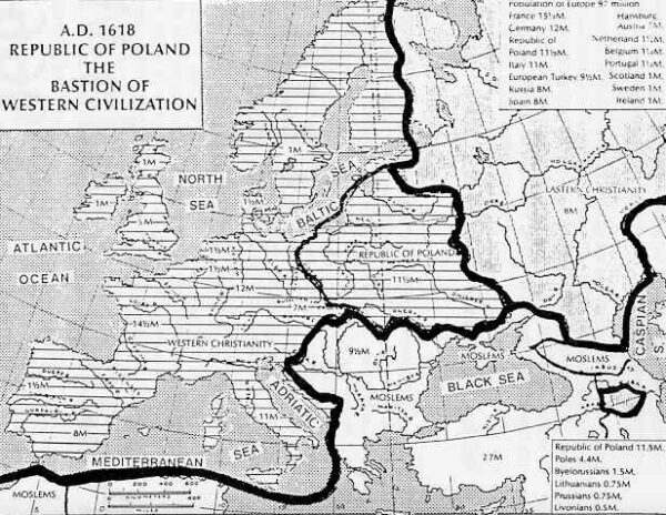 карта состояние Европы в 1618 году, подтверждающая тезис Польской республики (Речи Посполитой) как *бастиона западной цивилизации* или *щита Запада* перед варварами с Востока — Московия, татары и Оттоманская империя…