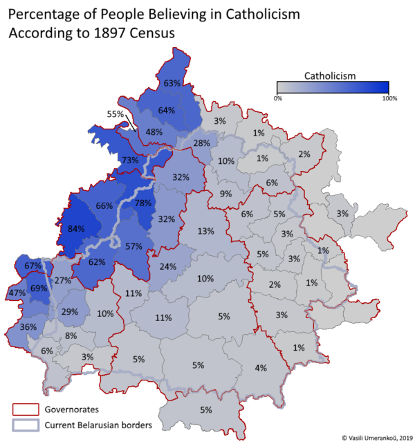 Карта католиков по уездам Российской Империи (Беларусь и прилегающие территории) согласно переписи 1897 года.С падзякай за мапы да @Васіль Умеранкоў