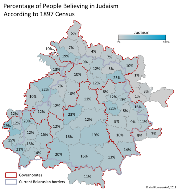 Карта иудейского вероисповедования по уездам Российской Империи (Беларусь и прилегающие территории) согласно переписи 1897 года. С падзякай за мапы да @Васіль Умеранкоў