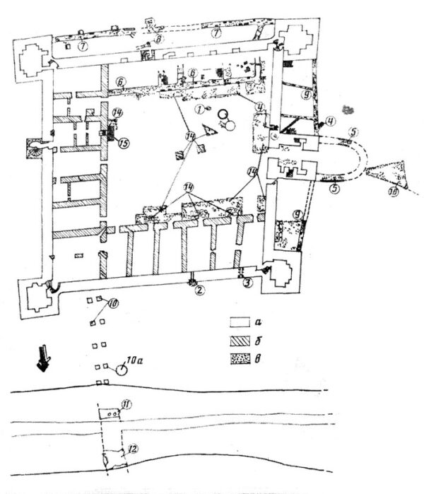 Ситуационный план Мирского замка после проведения архитектурно-археологических исследований. 1 — развал изразцовой печи рубежа XV—XVI вв. из первоначального поселения; 2 — древний мусоросборник, конец XVI — первая половина XVII в.; 3 — поздний водосток, 20-30 гг. XX в.; 4 — остатки водостоков XVI—XVII вв.; 5 — фрагменты стен и фундаментов предбрамья конца XVI — начала…