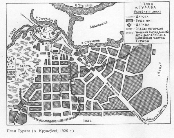 Новогрудок. Схематический план: 1 — замок, XIV-XVI вв.; 2 — фарный костел, начало XVIII в.; 3,4 -Борисоглебская церковь, XVI- XVII вв. и монастырские постройки; 5 — торговые ряды, XIX в.; 6 -доминиканский костел, перв. пол. XVIII — перв. пол. XIX вв.; 7 — Николаевская церковь (бывш. костел францисканцев), конец XVIII — вт. пол. XIX вв.;…