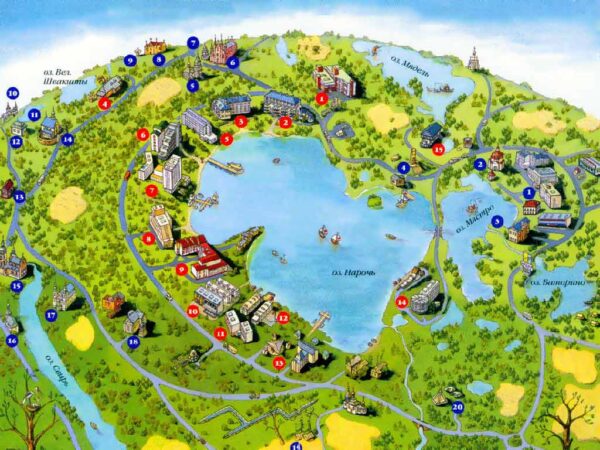 Красные 1. Санаторий «Белая Русь». 2. Пансионат «Нарочанский берег». 3. Санаторий «Нарочь». 5. Гостиница «Нарочь». 6. Санаторий «Приозёрный». 7. Туркомлекс «Нарочь». 8. Пансионат «Спутник». 9. Санаторий «Боровое». 10. База отдыха «Чайка». 11. Пансионат «Журавушка». 12. Детский санаторий «Зубренок». 13. База отдыха «Нарочанка». 14. Санаторий-профилакторий «Сосны». 15. База отдыха «Рудаково». Озеро Нарочь. Достопримечательности.Схема. санатории. профилактории.карта