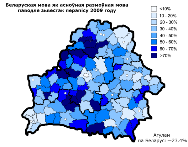 Карта использования белорусского языка. Белорусский язык как родной в 2009 году на территории Республики Беларусь… и ниже — сравнение с 1999 годом