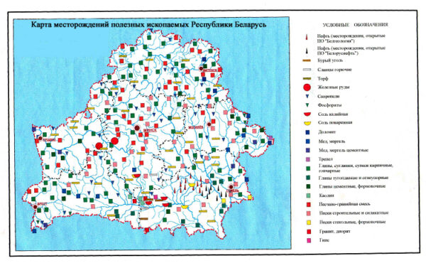 Полезные ископаемые Белорусии, карта Карта полезных ископаемых Беларуси