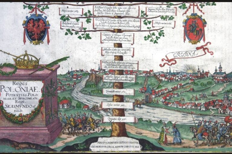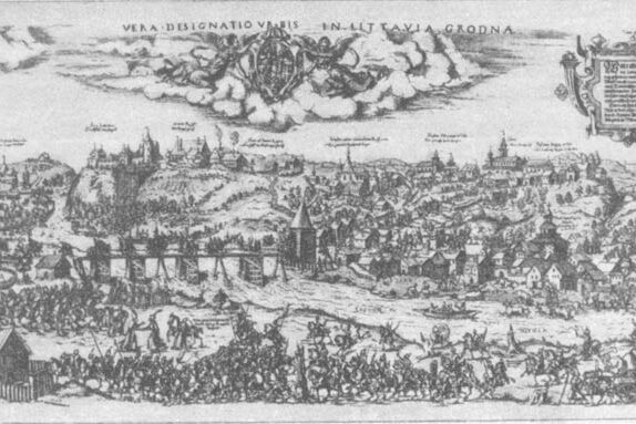 и чуть увеличенный фрагмент рисунка Предполагают, что сцена на первом плане гравюры изображает первую встречу поляков с русским посольством во главе с Ф. И. Колычевым, прибывшим в 1567 г. в Гродно для переговоров о перемирии, выдаче князя Курбского и пропуске русских купцов через Польшу в Царьград. Очень похожая картина (1568), не знаю какая из них…