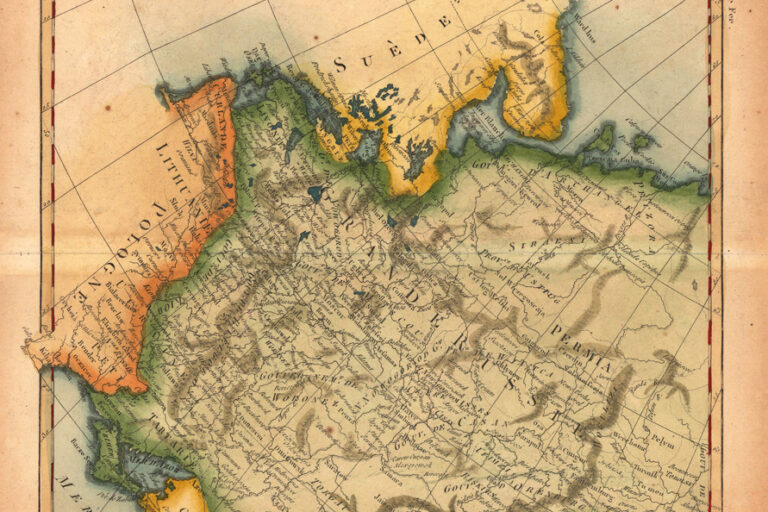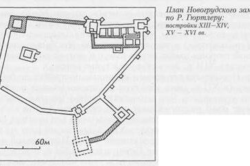 Новогрудок. Схематический план: 1 — замок, XIV-XVI вв.; 2 — фарный костел, начало XVIII в.; 3,4 -Борисоглебская церковь, XVI- XVII вв. и монастырские постройки; 5 — торговые ряды, XIX в.; 6 -доминиканский костел, перв. пол. XVIII — перв. пол. XIX вв.; 7 — Николаевская церковь (бывш. костел францисканцев), конец XVIII — вт. пол. XIX вв.;…