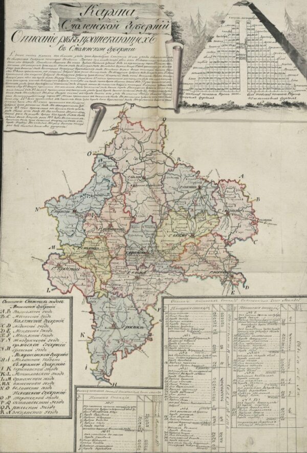 Атлас Смоленской губернии издан в Смоленске в 90-е года 18 века. Состоит из 25 листов размером 25 на 20 см, 12 листов атласа представляют карты уездов Смоленской губернии, остальные — планы уездных городов. Карты рукописные, раскрашены акварелью. Полностью АТЛАС ЗДЕСЬ