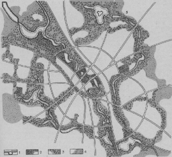 1 — акватории; 2 — парки городского значения 3- парки районного значения 4 — лесопарки 5- микрорайон Зеленый Луг-5 …еще в в 1947 г. Минск имел всего 30 га зеленых насаждений