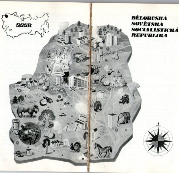 Běloruská sovětská sociálistická republika, 1972 Карта из атласа СССР 1972 года, изданного в Чехословакии. Мило и забавно, социалистический реализм. Лично меня больше всего заинтересовало коневодство в Полесье