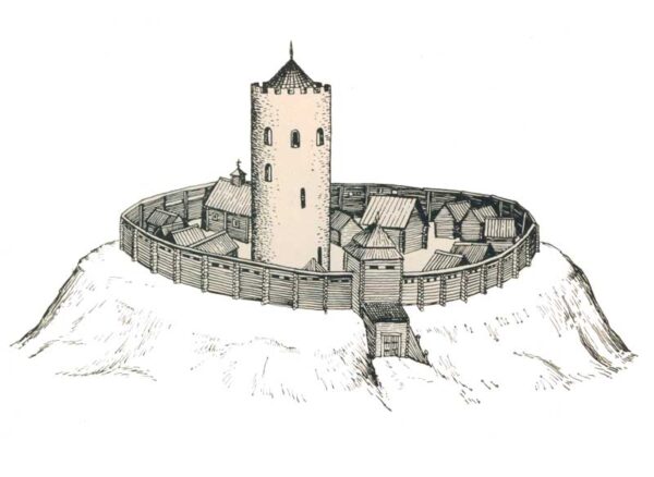 Белая вежа (реконструкция) Подробное описание истории города и замка(башни) ЗДЕСЬ Каменец.Туристический центр. 1 — башня-донжон 2 — Симеоновская церковь; 3 — рядовая застройка Более подробно о Каменце и Белой Веже здесь