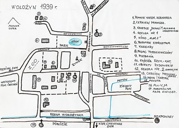 Памятник неизвестному солдату Православная церковь Дома чиновников Школа №1 Кино *Марс* Магистрат Казармы Дворец Тышкевичей Дом священника Костел римско-католический Еврейские объекты Школа №2 – гимназия Православная церковь Мельница и лесопилка Почта Полиция Сберегательная касса Воложин.план.1939.карта Воложина. Wołożyn. plan miasta.1939 mapa. plan of Wolozhyn.map.