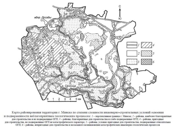 Каля чвэрці сённяшняй тэрыторыі Мінска схільна да неспрыяльных геалагічных працэсаў, не звязаных з антрапагенным (чалавечым) фактарам, сярод якіх, напрыклад, праблема натуральнай эрозіі халмістай часткі горада (складае да 15% ад тэрыторыі) або праблема падтаплення і забалочвання (каля 8% тэрыторыі, у раёнах вадасховішчаў і па ўскраінах горада). З гэтых фактараў ацэньваюць спрыяльнасьць і шчыльнасць забудовы адміністратыўных раёнаў…