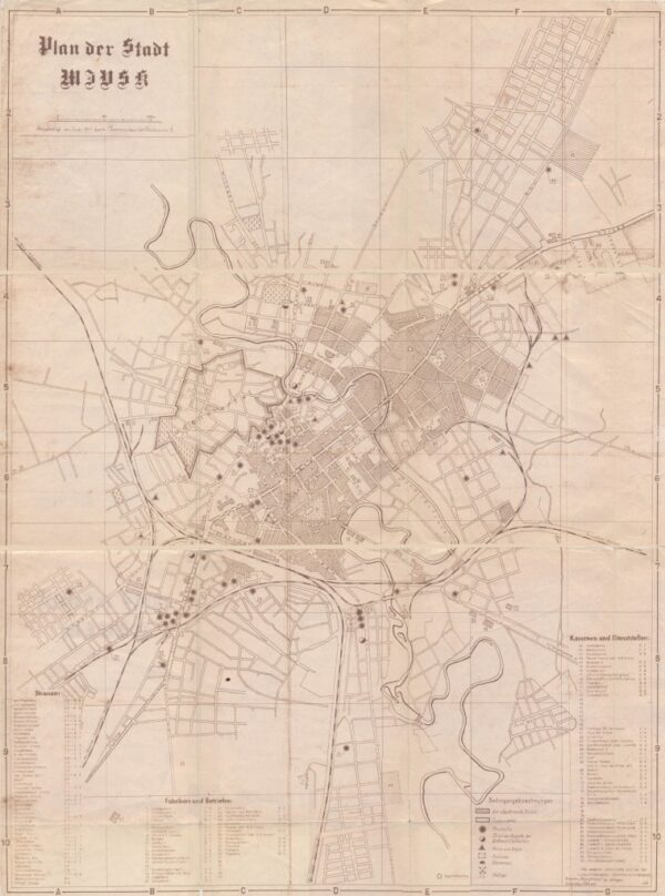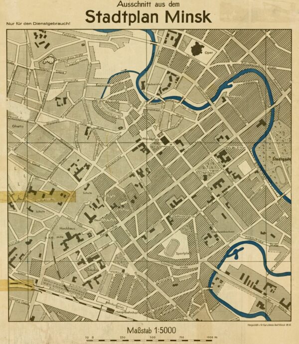 План города Минска. Подготовлен в июле 1941 командиром строительной части 9. Далее файл с подробным описанием названий улиц, предприятий и учреждений с переводом на русский в текстовом формате MS Word minsk1941 Также подробное описание карты можно онлайн прочитать ЗДЕСЬ