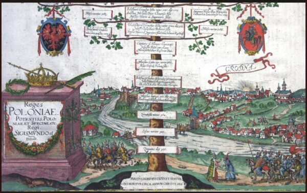 и чуть увеличенный фрагмент рисунка Предполагают, что сцена на первом плане гравюры изображает первую встречу поляков с русским посольством во главе с Ф. И. Колычевым, прибывшим в 1567 г. в Гродно для переговоров о перемирии, выдаче князя Курбского и пропуске русских купцов через Польшу в Царьград. Очень похожая картина (1568), не знаю какая из них…