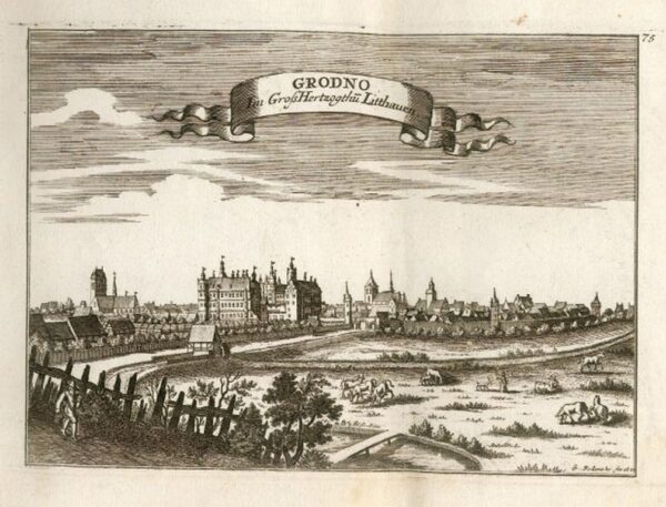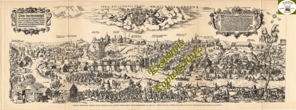 В правом верхнем углу гравюры дан объяснительный текст: «Истинное изображение города Гродно в Литве. Там его польское королевское величество держало сейм и туда же приехали нижепоименованные посольства, во-первых, Великого князя Московского, в числе 1200 человек, очень великолепно одетых, потом посольство Турецкое, Татарское и Валахское, и были приняты в поле особыми на то назначенными от вышеупомянутого…