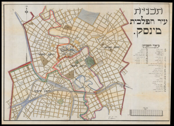 Тлумачэньне пляну: п.1. [א] Яўрэйская абшчына (кегіла) п.2. [ב] Школьны двор у ім знаходзяцца: а) [א] Вялікі бэйс-мэдрэш б) [ב] Сінагога в) [ג] Пахавальнае брацтва г) [ד] і бэйс-дын п.3. [ג] Харальная сінагога п.4. [ד] Сінагогі п.5. [ה] Рамесьніцкая вучэльня п.6. [ו] Талмуд-Тора п.7. [ז] Яўрэйская бібліятэка імя Нэйфаха п.8. [ח] Яўрэйская бальніца і прытулкі…